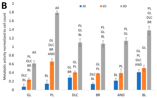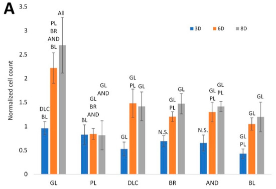 Another analysis was focused on calcium consumption by cells from the culture medium, which is positively correlated with the level of cell differentiation toward osteoblasts. It can be assumed that the depletion of Ca from the culture medium is proportional to the deposition of this mineral into the ECM newly formed by the cells [18]. Our results, normalized to cell counts (Figure 9A), showed that the depletion of Ca from the culture medium increased in the same order as the surface roughness, i.e., GL ˂ PL ˂ DLC ˂ BR ˂ AND ˂ BL, although no significant difference was found among the BR, AND, and BL samples on days 6 and 8 of cell cultivation. Only on day 3 of cell cultivation, the medium taken from the BL samples showed relatively low calcium depletion, which was comparable with the DLC and PL surfaces, but was significantly lower than on the BR and AND surfaces. The lowest calcium depletion was found in the medium from the glass control, which corresponded to the relatively low metabolic activity of the cells on this substrate. In the PL and DLC samples, the calcium depletion from the culture medium was slightly but significantly higher than for glass at later culture intervals (especially on day 6). In addition, in all tested samples, the depletion of calcium from the culture medium increased with time, i.e., from day 3 to 8, and this increase was most apparent in the BL samples (Figure 9A).