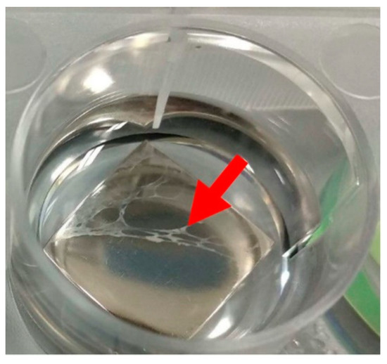 A cell layer peeled off the smooth surface of a polished sample (arrow). This phenomenon was observed on all samples with roughness below 25 nm, i.e., GL, PL, and DLC, but it was most noticeable on PL. These samples were excluded from the analysis.