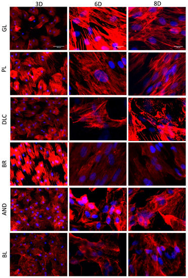 The cell morphology and the orientation of the cells on the tested samples was evaluated in cells stained fluorescently for F-actin in their cytoskeleton (Figure 6). The staining revealed that the cells on all investigated surfaces were well-spread with a polygonal or elongated (i.e., spindle-shaped) morphology. The elongated morphology was apparent especially on the BR surface, where the cells, including their F-actin filaments, were oriented in parallel to the grooves in the surface of the material (Figure 6). However, some tendency toward elongation and parallel orientation of the cells was also apparent on days 6 and 8 on the control glass surfaces and on the polished Ti6Al4V surfaces, i.e., on flat surfaces with no detectable cues for cell guidance. On the DLC, AND, and BL surfaces, the cells were mostly polygonal and randomly oriented (Figure 6).