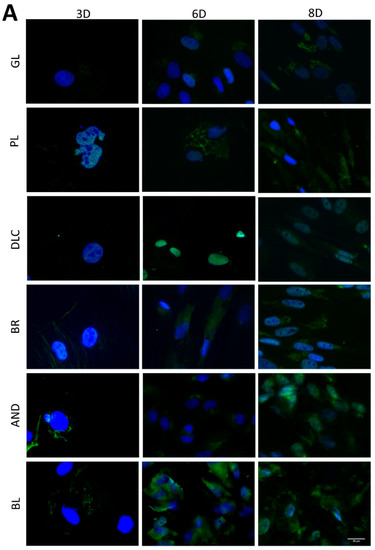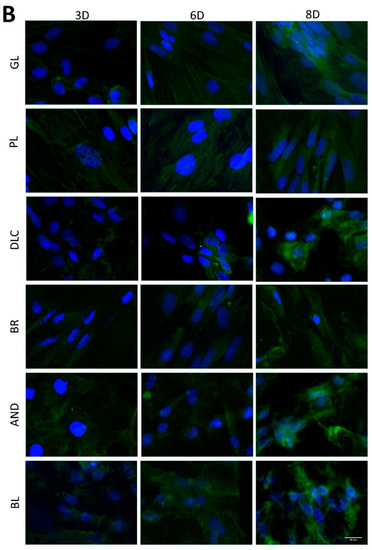 The effect of titanium treatment on the proliferation of ASCs is shown in Figure 4A. The cell number was estimated from the intensity of the fluorescence of the cell nuclei, which was recorded from the microscopy images of the cells on days 3, 6, and 8 of cultivation, and was normalized to the glass control on day 3. This analysis showed that, on day 3, the cell counts on the treated Ti6Al4V samples were similar to or slightly lower than on the reference glass coverslips. However, on days 6 and 8, the cell counts on all treated Ti6Al4V samples were significantly lower than on the corresponding control glass substrates (p < 0.05). On the polished Ti6Al4V surface, the cell population density from day 3 to 8 even remained constant, i.e., there was no increase, although on day 3 the cell counts on these samples were relatively high and were comparable with the values on glass. On the other Ti6Al4V samples, the cell number increased, but this increase was well-apparent only between days 3 and 6, while, the cell number tended to stagnate between days 6 and 8. The cell counts on the DLC, BR, and AND samples were comparable, while on the BL samples the cell counts were slightly lower (i.e., significantly lower only than on glass).