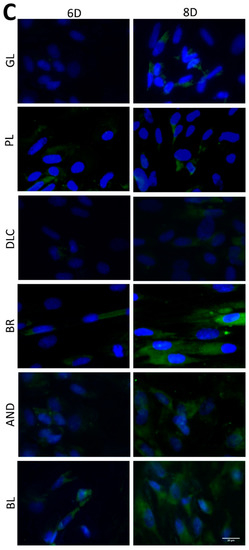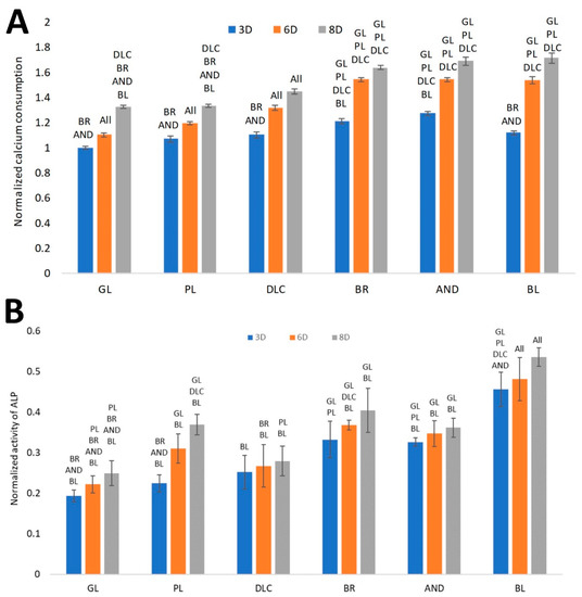 The ALP activity, normalized to cell counts (Figure 9B), showed a similar increasing trend as for the depletion of calcium from the culture medium. The significantly highest activity of ALP was found in the cells on the BL samples, followed by the values on the BR and AND samples, which were comparable. Relatively high ALP activity (per cell) was found on the PL samples on day 8. This may have resulted from the relatively low cell count to which the activity was normalized. The lowest ALP activity was revealed in the cells on the glass samples, which corresponded with the other results obtained regarding the osteogenic cell differentiation.