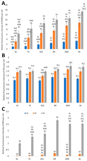 In order to further confirm the results obtained visually from the cell images, the amount of osteogenic markers in the cells was estimated by measuring the fluorescence intensity of these markers on all samples after 3, 6, and 8 days of cultivation (Figure 8). Interestingly, the intensity of the fluorescence of the early marker RUNX2 increased in the same order as the material surface roughness, i.e., GL ˂ PL ˂ DLC ˂ BR ˂ AND ˂ BL (Figure 3A and Figure 8A). The intensity of the fluorescence of COL1, another early marker of osteogenic cell differentiation, was rather similar in the cells on all tested samples, especially on day 3, but on days 6 and 8 the highest average values were obtained in cells on the AND samples (Figure 8B). Surprisingly, the values on the BL samples were relatively low, and were similar to the values on the reference glass sample. In accordance with this, the intensity of the fluorescence of OPN, an intermediate osteogenic marker, in the cells on the BL samples was also relatively low, i.e., significantly lower than on the BR samples. The intensity of the fluorescence of OPN showed a strong increasing trend similar to RUNX2, i.e., proportional to the increasing surface roughness, but it reached its maximum on the BR sample and then decreased (Figure 8C).