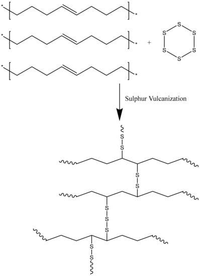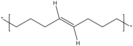 Scholars at present tend to use additives i.e., bio-oil, organic montmorillonite, among others to apply the composite modification to CRMA to overcome the drawbacks of ageing and storage stability [,]; however, these kinds of additives only improve the performance of CRMA at the physical level, and the improvement of CRMA performance is not ideal. Therefore, CR can be modified and activated by adding a reactive additive such as a crosslinking agent, and can also be added by adding polyphosphoric acid and a polymer compatibilizer having an unsaturated bond, improving the compatibility of CR and bitumen [,]. Trans-polyoctenamer (TOR) is a high molecular polymer additive with many unsaturated bonds in the molecule and high reactivity []. The chemical structure of TOR is listed in Figure 1. TOR is a polymer composed of linear and cyclic macromolecules. The double bond in the structure undergoes a cross-linking reaction with the sulfur component on the surface of CR []. Figure 2 shows the reaction mechanism of TOR vulcanization. The cross-linking reaction between sulphur and polyoctenamer is anticipated to mainly occur at the carbon–carbon double bonds (C = C). Due to the addition of TOR linker in CR and matrix bitumen, new molecules are synthesized, which are complex in composition and have large changes in properties []. Some studies found that the addition of the activator TOR to the CRMA has outstanding effects on pavement anti-cracking, waterproof, sound insulation and noise reduction [,]. In addition, the preparation process is easy and flexible, construction workability and heat storage stability are good, and it is suitable for various types of bitumen pavement maintenance engineering [].