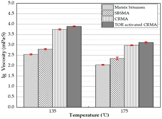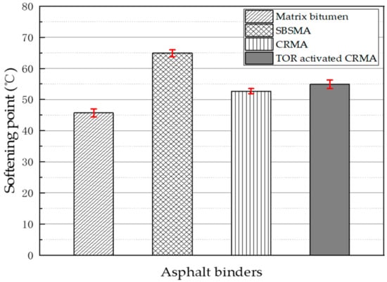 Figure 3 shows that the softening point of modified asphalt binders elevates obviously compared with matrix bitumen. TOR additive had a greater effect on the softening point of TOR-activated CRMA, although the improvement of CRMA activated by TOR is lower than that of SBSMA. It can be seen from Figure 4 that the viscosity of the four samples decreases with increasing temperature. The viscosity of TOR-activated CRMA was greater than that of other asphalt binders under the same temperature, and the mechanism of TOR was involved in the advance of viscosity.