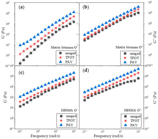 Viscoelastic parameters versus frequency of unaged and aged matrix bitumen and SBSMA at 60 °C. (a) Matrix bitumen G′; (b) Matrix bitumen G″; (c) SBSMA G′; (d) SBSMA G″.