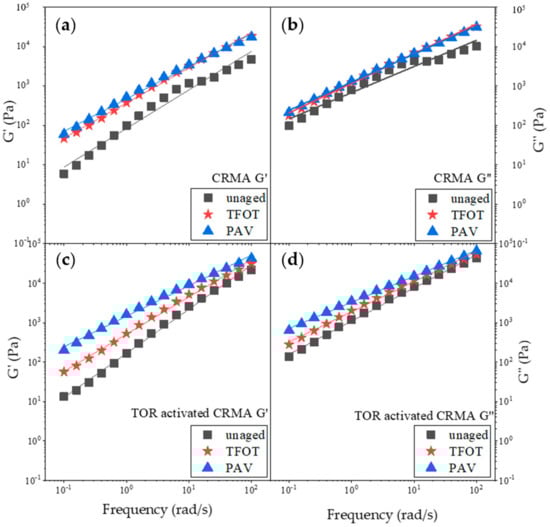 Viscoelastic parameters versus frequency of unaged and aged crumb rubber modified asphalt (CRMA) and TOR-activated CRMA at 60 °C. (a) CRMA G′; (b) CRMA G″; (c) TOR activated CRMA G′; (d) TOR activated CRMA G″.