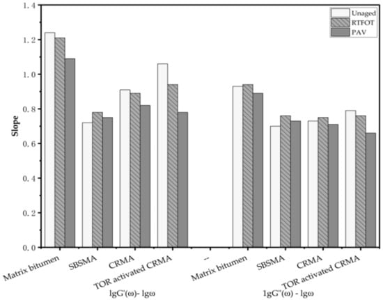 Figure 7 shows that the slopes of G′ and G″ were relative to the angular frequency of various asphalt binders at 60 °C. The slope of lg G′(ω) and lg G″(ω) for the lg w were less than 2 and 1, respectively, indicating that the four samples are all heterogeneous systems. The degree of deviation was, however, different. For unaged samples, it can be obtained from Figure 7 that the degree of heterogeneousness is: SBSMA > CRMA > TOR-activated CRMA activator > matrix bitumen. The CRMA and the TOR-activated CRMA were compared separately. The former had a negative degree of homogeneity, because there will be surface hardening, desulfurization and the like, which is not conducive to fuse between the CR and the asphalt binder. For TOR-activated CRMA, TOR alleviated the compatibility of CR with matrix bitumen. The slope values of TOR-activated CRMA were greater than those of CRMA; however, with the deepening aging, the degree of heterogeneousness of TOR-activated CRMA became the biggest, which means more light components lessened, corresponding to the weakest aging resistance.