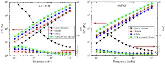 The phase angle is illustrated in tan δ in Figure 8. Tan δ is identified as the ratio of G″ to G′, which presented a balance of viscous/elastic performance. Higher tan δ values indicated that the bitumen material exhibited more viscous behavior. According to the survey, in the frequency range studied and at 60 °C, the tan δ of all asphalt binders was always >1, which means the main viscous behavior. The tan δ of matrix bitumen showed a sharp decrease. On the contrary, SBSMA showed a substantially unchanged tan δ in the low and high frequency range. The tan δ of CRMA and TOR-activated CRMA decreased rapidly in the low frequency region, and decreased slightly in the high frequency range.
