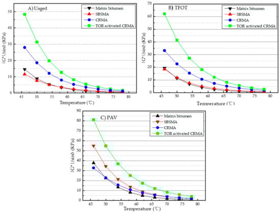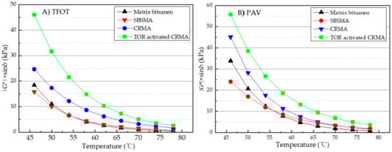 The aging of the binder mainly consisted of two parts, volatilization and oxidation. Especially for the matrix bitumen (KLM110) with a large number of light components, the performance change of the modified asphalt binder occurring in the aging process was not negligible. Figure 9B shows that after short-term aging, the rutting factor of all samples decreased with increasing temperature and decreased slowly after a certain temperature. After TFOT aging, the rutting factors of all asphalt binders were significantly increased. In addition, it indicated that the viscous component of bitumen increased sharply with increasing temperature, while the elastic component gradually decreased. At the same temperature, TOR-activated CRMA was more resistant to rutting than other binders were.