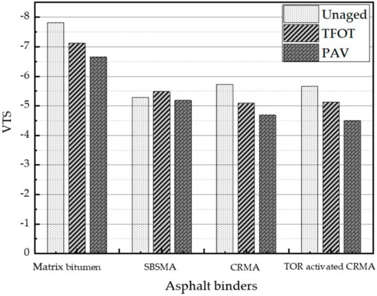 Figure 10 displays the VTS values of the four samples before and after aging. VTS values were sorted from large to small for unaged samples: matrix bitumen > CRMA ≈ TOR-activated CRMA > SBSMA. The VTS value of matrix bitumen was the largest, which indicated that it had the largest rate of change with temperature and was most sensitive to temperature changes. It can be seen that the addition of modifier can significantly improve the temperature sensitivity of asphalt binder.
