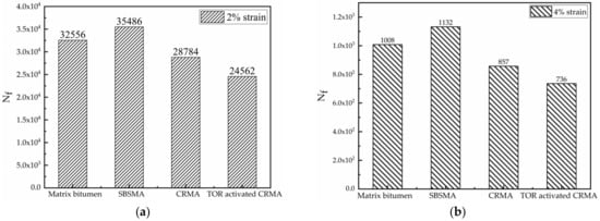 Fatigue life obtained using linear amplitude sweep (LAS) testing of asphalt binder at (a) 2% strain and (b) 4% strain level.