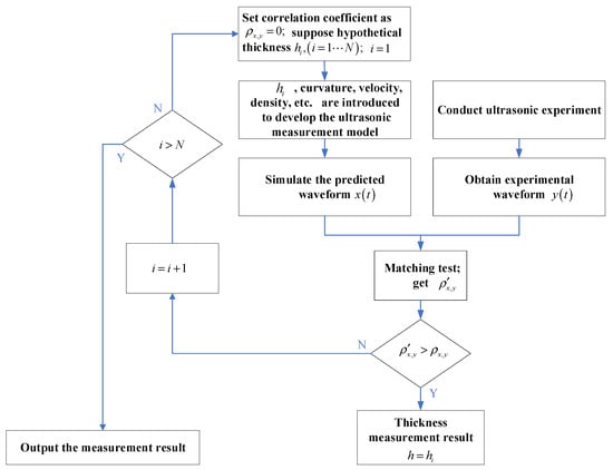 The overall scheme of the method is shown in Figure 1. The curvature, velocity, density and hypothetical wall thickness of the trailing arm are included to develop the ultrasonic measurement model; the theoretical ultrasonic waveform can be predicted for the trailing arm; ultrasonic experiment is conducted to obtain a real waveform, and then it is matched with the predicted waveform by using a correlation coefficient, which will be shown in Section 2.3. The hypothetical thickness is output as the measurement result if the correlation coefficient is a maximum.