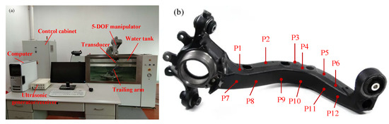 Automatic ultrasonic measurement: (a) experimental setup; (b) a trailing arm.