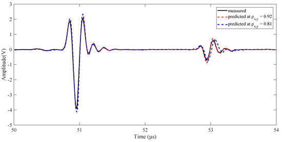 To further illustrate the matching process of the proposed method, Figure 4 indicates an experimental waveform and two predicted waveforms when are 5.74 and 5.85 mm, and their correlation coefficients are 0.92 and 0.81, respectively. One can see from Figure 4 that the predicted waveform matches with experimental waveform better when the correlation coefficient is bigger. Note that these two predicted waveforms are calculated using the same parameters with different angles of incidence (2° and 0°), which shows that it is necessary for the ultrasonic beam to radiate into the trailing arm at normal incidence.