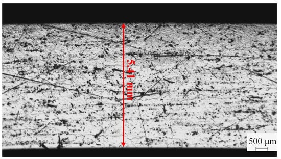 To verify the validity of automatic ultrasonic measurement, the trailing arm undergoes subdivision, stripping, and slicing, then the thickness measurement is performed on the planned points with a micrometer (Mitutoyo, M110-25), whose specification of measurement error is 0.01 mm. Table 2 shows the results measured with different methods and their relative errors. As this shows, the relative errors between the results measured with micrometer and the present method are within 0.08 mm, which meets the measurement requirement of a trailing arm manufactured by casting. Because the relative errors between the results measured with micrometer and the conventional ultrasonic thickness measurement method are much higher, the ultrasonic measurement accuracy will degrade if the curvature is not taken into consideration. In addition, Measurement with an Olympus SZX16 stereomicroscope is performed; Figure 5 indicates its measurement result of point 3, which agrees well the result determined by the present method.