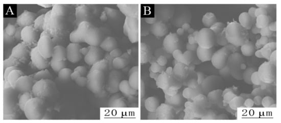 SEM images of the microcapsules with different core–wall ratios: (A) 0.67 and (B) 0.50.