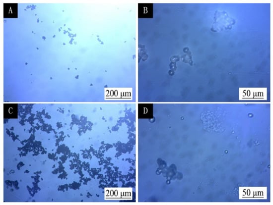 Microscopic pictures of the microcapsules with different core–wall ratios: (A,B) 0.67, (C,D) 0.50.