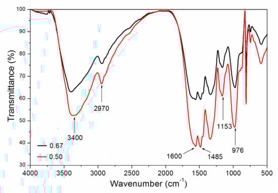 Figure 3 is the infrared spectrum of the MF-coated epoxy resin microcapsules of 0.50 core–wall ratio and 0.67 core–wall ratio. The peaks at 3400, 2970, 1600 and 1485 cm−1 are the stretching vibration peaks of the N–H, C–H, C=N, and C–N bonds, respectively [21]. The 1153 and 976 cm−1 are the expansion vibrations of C–O in epoxy resin [22]. The epoxy resin was liquid, and if it is not the core material of the microcapsule, it will be filtered out. The epoxy resin was coated by MF resin, which indicated that the preparation of the microcapsule was successful.