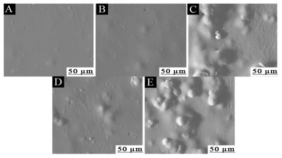 SEM images of the topcoat films with different microcapsule mass fractions: (A) topcoat; topcoat with (B) 4.0% and (C) 16.0% of 0.50 core–wall ratio microcapsules; topcoat with (D) 4.0% and (E) 16.0% of 0.67 core–wall ratio microcapsules.