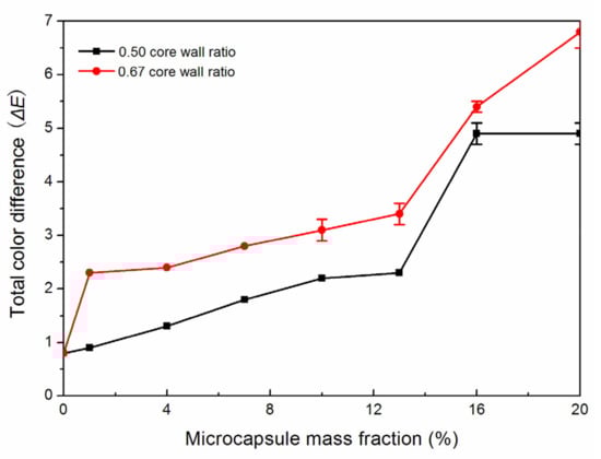 The color difference of the topcoat film was measured using SEGT-J portable color difference meter (Zhuhai Tianchuang Instrument Co., Ltd., Zhuhai, China). L* represents the lightness, and the large value means the surface color of the measured object is bright. The a* represents the change of color from red to green, the positive value means a reddish color, and the negative value means greenish. The b* represents the change of color from yellow to blue, the positive value means that the surface color of the measured object is yellowish, and the negative value means it is blueish. L1*, a1* and b1* are the chroma values of the coating sample without microcapsules, while L2*, a2* and b2* are the chroma values of the coating sample with different mass fractions of microcapsules. ΔL* (light difference) = L1* − L2*, Δa* (red–green difference) = a1* − a2*, Δb* (yellow–blue difference) = b1* − b2*. The total color difference was calculated according to the Formula (1) [18]: