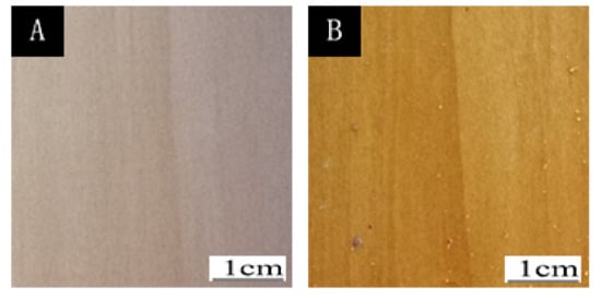 (A) Basswood; (B) coated basswood with 4.0% of the microcapsule with a 0.5 core–wall ratio.