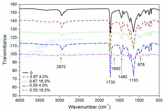 Figure 7 shows the FTIR spectra of the coating without microcapsule, with 4.0% and 16.0% of microcapsule (core–wall ratio of 0.67), with 4.0% and 16.0% of microcapsule (core–wall ratio of 0.50), respectively. At 1730 cm−1 there is a sharp characteristic peak of C=O, belonging to the transmittance of waterborne acrylic resin in the waterborne coating. With the change of the mass fraction of microcapsules, no peak disappeared or appeared in the infrared spectra of topcoats, which indicated that there was no difference in the composition of the coating [25].