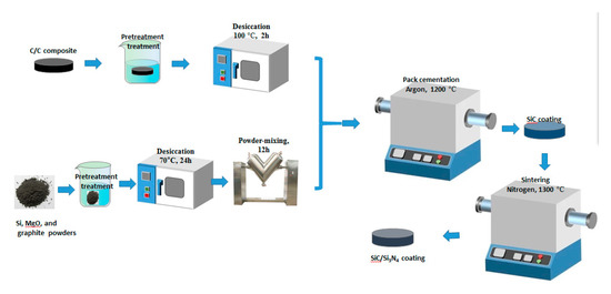 After treatment, the C/C composite specimens were packed with the as-prepared powder mixture and then placed in a crucible. The entire crucible was placed in a tube furnace, and SiC was formed upon heating the impregnated specimens under argon gas at 1100 °C for 8 h. The specimens were then allowed to cool passively in the furnace.