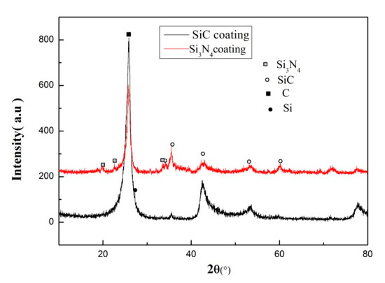 The nitrogen converts all residual Si to Si3N4 in the SiC/Si3N4 coatings, as indicated in Figure 3. The carbon phase includes the matrix phase and residual graphite.