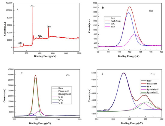 X-ray photoelectron spectroscopy (XPS) patterns of SiC/Si3N4-coated specimens. (a) spectrum and high resolution spectra of (b) Si2p, (c) C1s, and (d) N1s.