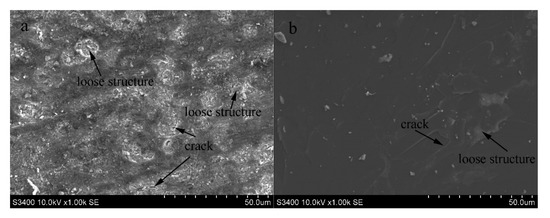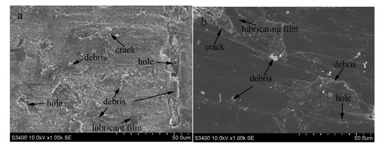 Figure 10a,b shows SEM images that reveal the morphology of the worn surface of specimens with the SiC coating and with the SiC/Si3N4 coating, respectively. These images show different levels of deterioration of the worn surfaces of the two specimens. Moreover, the typical debris and the characteristics of the worn surface are closely linked with the wear process, which helps to understand the wear mechanisms.