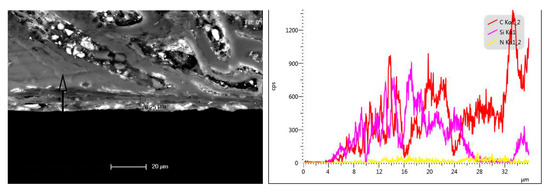 Figure 7 shows the cross-section of a SiC/Si3N4 coating and its energy dispersive X-ray spectrum (EDS). The coating is determined to be 8.25 µm thick. Si atoms that diffuse into the C/C composite react with the matrix, which increases the adhesion between these materials. In addition, the coating penetrates into the C/C composite, which also increases the adhesion between the materials. The EDS analysis reveals the presence in the SiC/Si3N4 coating of elemental Si, C and N, but no MgO.