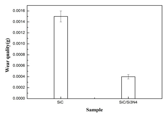 Figure 9 shows the average weight loss of several specimens, which is directly related to the friction coefficient. As shown in Figure 8, the friction coefficient of SiC coatings is unstable, so the weight loss is significant. The opposite is true for the SiC/Si3N4-coated specimens: the friction coefficient is lower and more stable, resulting in much less weight loss. Furthermore, the Si3N4 in the SiC/Si3N4 coatings is more resistant to wear than Si in the SiC coating, so the SiC/Si3N4 coating loses less mass than the SiC coating, which also contributes to the more stable friction coefficient of the SiC/Si3N4 coating.