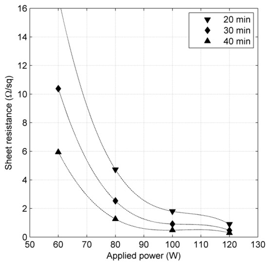 Sheet resistance dependency of the ZnO:Al films on sputtering power at different deposition time.