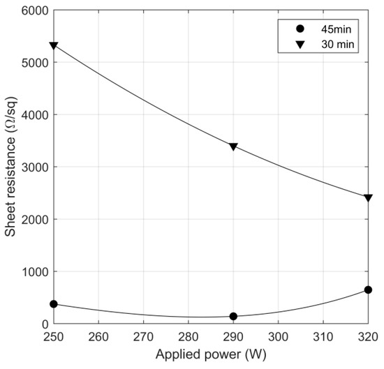 In order to obtain an aluminum-doped zinc oxide layer with the best sheet resistance, experimental campaign was carried out in the 250–320 W (3.08–3.95 W/cm2) power range. The deposition process was carried out in the pressure 0.287 Pa. In these studies, two deposition times were examined—30 and 45 min. Nonetheless, the layers obtained in 30 min were characterized by poor electrical conductivity. As can be seen from Figure 4, at the outset, the sheet resistance of the films, which were obtained for 250 W of power, was relatively high for implementation in the CIGS solar device. However, increasing the power to 290 W caused a decrease of the sheet resistance. The lowest Rs value, which was 141 Ω/□, occurred for a deposition time equal to 45 min. Further increasing the power applied to cathode did not cause decreasing the sheet resistance. Based on the previous studies [20], annealing treatment enhanced the electrical properties of transparent conductive oxides (TCO). Different times, up to 4 h, and temperatures in the 100–400 °C range were investigated. The best improvement of the conductivity was observed for two compilation of set parameters. In both cases, an approximately 3-fold decline was observed. The sample characterized by 141 Ω/□ was annealed in the temperature set at 300 °C by 3 h. After treatment, the Rs value decreased to 55 Ω/□.