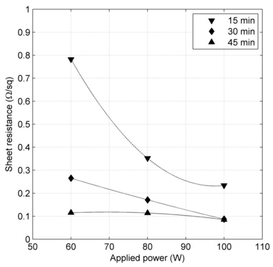 In order to collect charges from the bottom layers, transparent conductive oxide is covered by a metal grid mostly made of few micrometers of aluminum. The most common fabrication method is evaporation; however, consequently, sputtering was used in the case of this research. Electrical properties of aluminum contact films deposited on SLG were described in previous studies [21] in detail. Figure 5 shows the dependency of aluminum films’ sheet resistance on sputtering power and deposition time. Similarly to Mo back contact, Rs decreases with the increase of sputtering power. However, in contrast to Mo back contact material, conductivity of Al layer is higher for all studied values of applied powers and times (Rs is below 0.8 Ω/□). Moreover, above 30 min of deposition, a change in Rs value with sputtering power seems to be negligible. The lowest value of Al sheet resistance was obtained for sputtering power equals 100 W and 30 min of the deposition time (0.08 Ω/□).