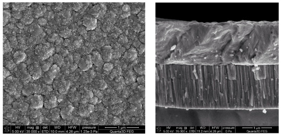 The fabricated layers were examined in order to find the structural and electrical properties. The EDS profile and energy spectra were performed by the EDS detector, which is integrated with scanning electron microscope (Hitachi SU3500, Tokyo, Japan), in a vacuum condition at 20.0 kV of operating voltage. It allowed performing qualitative and quantitative analysis of the obtained layers. Surface and cross-sectional images were prepared using FEI Quanta 3D FEG scanning electron microscope (Hillsboro, OR, USA). The crystalline structure and orientation of the deposited materials were analyzed by X-ray diffraction Empyrean PANalytical Diffractometer system. Sheet resistance was determined by the use of RM3000+ four-point probe equipment of Jandel Engineering Limited at room temperature.
