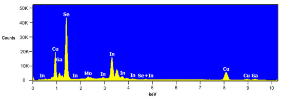 High-performance Cu(In,Ga)Se2 solar cells should be fabricated with Cu/(Ga + In) ratio (CGI) ranging from 0.7 to 1.0 and Ga/(Ga + In) ratio (GGI) between 0.2 and 0.3 [22]. In order to control both ratios, EDS analysis was carried out in this study. Figure 7 illustrates EDS spectra of CIGS absorber film deposited on soda lime glass (SLG) substrate covered by a molybdenum (Mo) back contact layer.