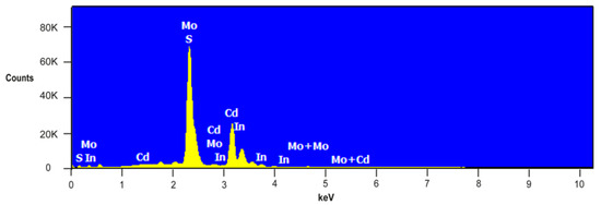 Figure 9 depicts EDS spectra of the SLG/Mo/CdS structure with characteristic peaks of CdS material: cadmium peak with characteristic X-ray energy Lα = 3.133 keV and sulfur with Kα equals 2.307 keV. CdS film was composed of 36.8 at.% of cadmium and 18.2 at.% of sulfur. Peak of molybdenum layer was also observed (with the amount of 45 at.%).
