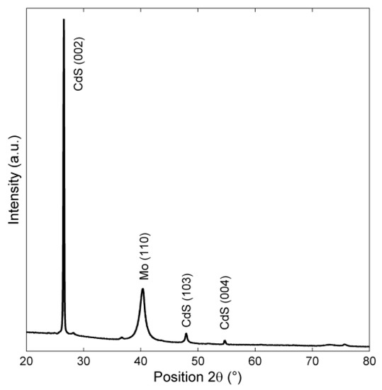 In order to investigate the crystal structure and grain size of cadmium sulfide buffer, Cu Kα (λ = 1.54056 Å) XRD pattern of CdS film deposited on Mo layer was obtained (Figure 10). The temperature of the substrate during the deposition process was 200 °C.