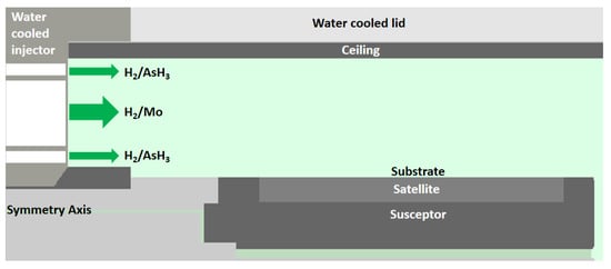 The development of metal-organic chemical vapor deposition (MOCVD) technology has contributed to improving the performance of the optoelectronic devices, such as the edge emitting laser (EEL) [1,2], vertical-cavity surface-emitting laser (VCSEL) [3,4], and photovoltaic cell (PVC) [5,6]. However, the cost of epitaxy is still too high for many applications. Enlarging the MOCVD chamber and using larger wafers are the possible approaches to deal with the problem. In the past decade, many large chamber reactor designs have been developed, including the close-coupled showerhead (CCS) [7,8,9], the high speed rotating disk reactor (RDR) [10,11], and the planetary reactor [12]. Compared to the other two, the planetary reactor has attracted more attention due to its higher material utilization. However, as a type of horizontal reactor [13], it is difficult to control the depletion profile and premature reactions. One of the current planetary MOCVD configurations introduces an injector design which has two flow channels to separately supply group III and V precursors to prevent premature reactions. MO-precursors are injected through the top channel with the carrier gas, and hydrides along with carrier gas are injected through the bottom channel. When the size of the reactor chamber is further expanded to facilitate higher wafer capacity, more precise control of the depletion profile is required. The hydride gas flowing through the bottom channel acts as an impedance to the growth nutrients that diffuse to the wafer surface due to its density and momentum, resulting in poor utilization efficiency of MO-precursors [14]. To solve this problem, a new planetary MOCVD with a third gas inlet above the MO injector channel was designed to supply hydride species, which is shown schematically in Figure 1. The third channel provides more control over the peak position of the depletion profile, resulting in higher reactant utilization efficiency. Furthermore, the ratio of the hydride gas flow rates is a tuning parameter for the growth rate uniformity [15].