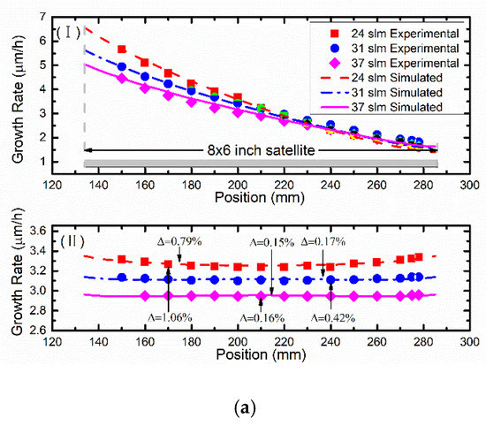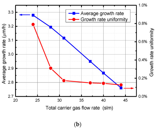 As shown in Figure 3a-I, the static growth rates show linearly declining profiles along the wafer diameter due to the depletion of MO-precursor species. At higher carrier gas flow rate, the depletion of MO-precursors’ decomposition by-products is pushed further downstream, and thus, the slope of the static depletion profile decreases. Uniform growth rates are obtained by rotating the individual substrates. As shown in Figure 3a-II, with the carrier gas flow rate increased from 24 to 37 slm, the experimental growth rate uniformity changes from 1.06% to 0.16%, and the simulation results decrease from 0.79% to 0.15%. These results indicate good predictability of the simulation model. Numerical modeling allows for speedy optimization the growth rate uniformity under complex process conditions. As shown in Figure 3b, the growth rate uniformity changes from 0.79% to 0.13% with the carrier gas flow rate increased from 24 to 44 slm. Based on the balance of the growth rate uniformity and the cost of the source materials, a growth rate of 2.95 μm/h with uniformity of 0.16% at carrier gas flow rate of 37 slm was selected in this study.
