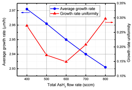 The hydride flow rate is another important tuning factor to further optimize the growth rate uniformity. Figure 4 shows the effects of total AsH3 flow rate on growth rate and its uniformity. By increasing the total AsH3 flow rate from 400 to 800 sccm, the growth rate decreases from 2.97 to 2.93 μm/h and the growth rate uniformity changes from 0.29% to 0.15%, 1σ. The best growth rate uniformity can be obtained at the total AsH3 flow rate around 600 sccm.