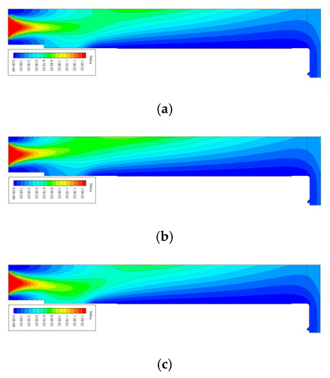 Two-dimensional distribution of TMGa in the reactor chamber for various top to bottom AsH3 ratios: (a) 300:300; (b) 100:500; (c) 500:100.