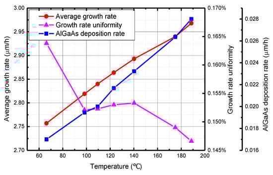 As shown in Figure 7, the temperature of the ceiling affects the growth rate, growth rate uniformity, and AlGaAs deposition rates on the ceiling. The ceiling temperature is tuned by the ratio of nitrogen and hydrogen (N2/H2). The N2/H2 mixture gas injects through the narrow gap between the ceiling and the water-cooled reactor lid. By tuning the ratio of the mixture gas, an optimal ceiling temperature with good growth rate uniformity can be selected. The ceiling temperature affects the temperature distribution along the horizontal and vertical substrate axis [12]. As Figure 7 illustrates, a poor growth rate uniformity was obtained at a lower ceiling temperature due to the arsenic-containing species condensing on the ceiling under such conditions, resulting in poor temperature uniformity over the substrates [20]. With the ceiling temperature increased from 66 to 188 °C, the growth rate increased from 2.76 to 2.96 μm/h, and the growth rate uniformity changed from 0.16 to 0.15%. However, with the ceiling temperature increased, the deposition rate of AlGaAs on the ceiling increased, resulting in a shortened ceiling lifetime [21]. With the ceiling temperature increased from 66 to 188 °C, the deposition rate of AlGaAs increased from 0.017 to 0.028 μm/h. Based on the above results, a ceiling temperature around 175 °C was selected in this study. Under said condition, arsenic-containing species were not easily condensed on the ceiling, and the AlGaAs deposition rate was slow enough, so a good growth rate uniformity was obtained on the 6-inch wafers.