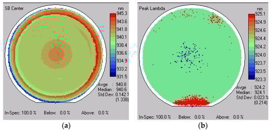 Distribution map of (a) DBR (Distributed Bragg Reflector) stop-band center and (b) quantum well wavelength over the 6-inch wafer (5 mm edge exclusion).