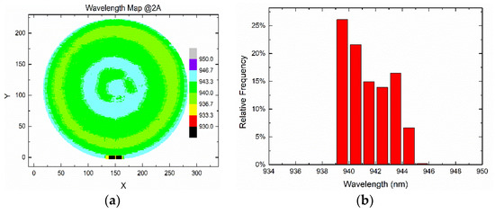 Performance of VCSEL devices over the 6-inch wafer measured by probing station made by Chroma (model) at 2A: (a) wavelength distribution map, (b) frequency statistics of wavelength.