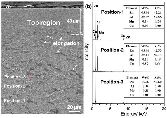 Figure 2a,b give SEM micrograph of the top region in the SFT sample (a) and the corresponding EDS analysis results (b). In the Figure 2a, the region away from the top ~40-μm-thickness has many dark gray structures with size 10~20 µm distributing uniformly in the matrix and they are obviously elongated as these structures are close to the top surface. Figure 2b supplies the corresponding component alloying elements at three different regions. Regions 1–2 and region 3 are the areas from the dark gray structures and alloy matrix, respectively. The corresponding atom percentage of Zn and Al are ~43 and ~57 at.% and ~93.60 and ~5.50 at.%. Therefore, the dark gray structures can be called as eutectic phase.