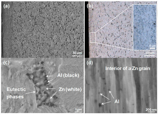 To obtain more information of eutectic phase distribution, Figure 3a,b give SEM and LCM cross sectional images. The right inset in Figure 3b provides the amplifying graph taken at the treated surface, which can be found that the eutectic phase is broken into small particles on the top surface. Figure 3c shows the further amplifying graph of the eutectic phase, which are agglomerates of Zn-rich (the white) and Al-rich (the black) grains. Additionally, careful microstructural observation provides direct evidence for the existence of ultrafine Al grains (several nanometers) in the Zn matrix as shown in Figure 3d.