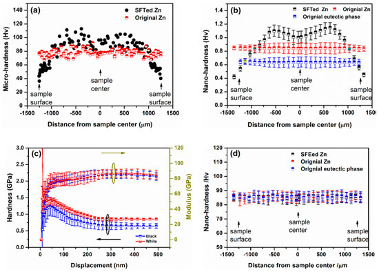 Figure 5a,b reveal the micro- and nano- hardness measurement of the cross profile in the different regions on the SFT-treated Zn alloy. Figure 5a shows the microhardness as a function of the distance from the center of as-annealed and SFT samples. It can be seen that the most of the regions in the SFT-treated Zn alloy become harder compared with that in the as-annealed sample. The H reaches the maximum value in the middle region and becomes softening on the deformed surface after severe deformation. To compare with the mechanical properties of eutectic phase, all the nano-hardnesses are measured at indentation depth of 500 nm. Figure 5c gives the continuous E and H of original Zn and eutectic phase at depth of 500 nm using CSM mode. As the indenting depth is larger than 300 nm, both of the E are 85 Gpa and the H are 0.85 and 0.65 GPa, respectively. Figure 5d exhibits the corresponding E values in Figure 5b that all the values are almost 85 GPa, which illustrates the measured H is reliable. The variation tendencies of the nanohardness in the as-annealed and SFT samples are similar with the microhardness and both of them exhibit “M”-shaped hardness curves. Interestingly, it can be found that the hardness of the eutectic phase is apparently larger than the hardness obtained on the surface. The volume percentage of Al phases is statistically calculated to be 4.85% in the surface layer, which is obviously less than that in the eutectic phase. Thus, it can be concluded that the material softening cannot be attribute to the distribution of Al phase in the top layer.