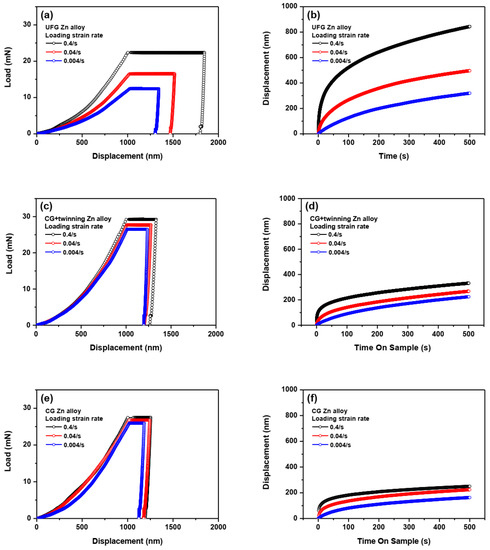 (a,c,e) Load–displacement and (b,d,f) creep displacement–time curves obtained at loading strain rate of 0.4, 0.04 and 0.004/s with holding time of 500 s in the UFG/CG+twinning/CG Zn alloy.